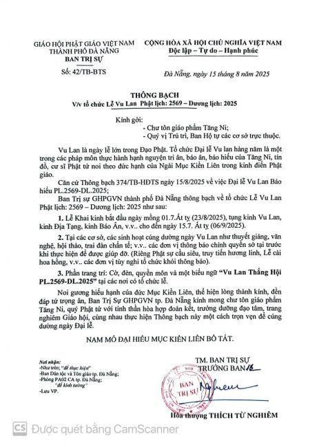 Ban Trị sự GHPGVN thành phố Đà Nẵng thông bạch về tổ chức Lễ Vu Lan Phật lịch: 2569 – Dương lịch: 2025 như sau: