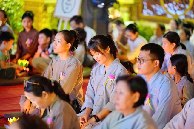Trong giây phút thiêng liêng, ánh đèn được hạ xuống, từng đóa hồng hiếu hạnh nâng niu trên đôi tay của hàng Phật tử, hòa quyện cùng ánh nến lung linh tỏa sáng. Cả không gian trở nên trang nghiêm, xúc động, như một lời nhắc nhở về tình thương, sự tri ân và báo ân sâu nặng của người con đối với cha mẹ.
