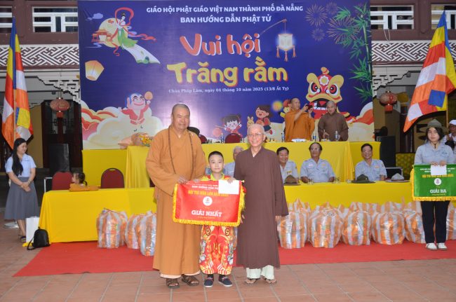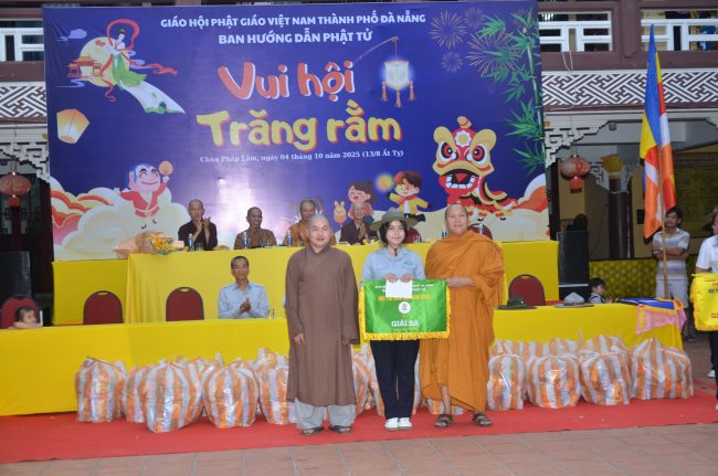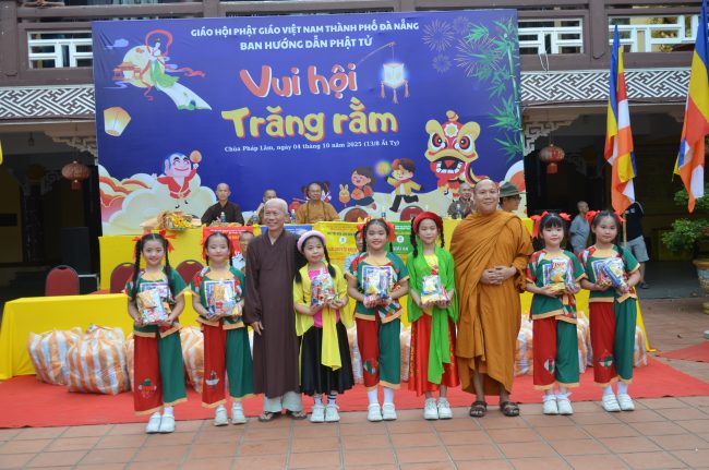 Tết Trung thu là nếp văn hóa lâu đời của người Việt Nam. Vào dịp này, các em nhỏ đón nhận sự quan tâm đặc biệt của toàn xã hội: được tặng lồng đèn, bánh kẹo; được xem múa lân, tham gia chương trình văn nghệ. Trên tinh thần này, chiều ngày 04 tháng 10 năm 2025 (nhằm ngày 13 tháng 8 năm Ất Tỵ), tại chùa Pháp Lâm – 574 Ông Ích Khiêm, phường Hải Châu, Tp Đà Nẵng; Ban Hướng dẫn Phật tử GHPGVN thành phố Đà Nẵng đã tổ chức chương trình “Vui hội trăng rằm” dành cho các em đoàn sinh Oanh vũ các đơn vị Gia đình Phật tử lân cận và các cháu thiếu nhi tại địa phương.