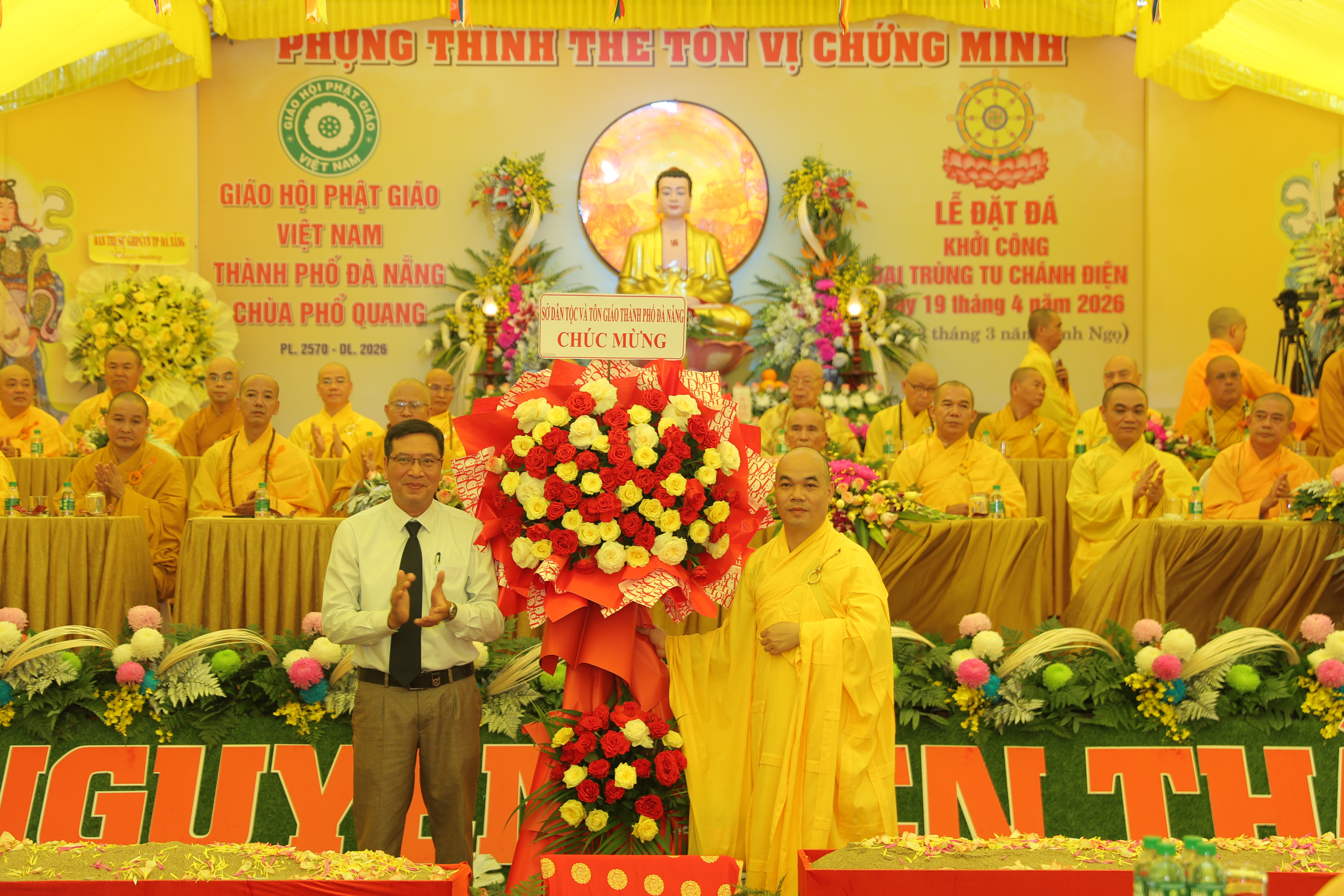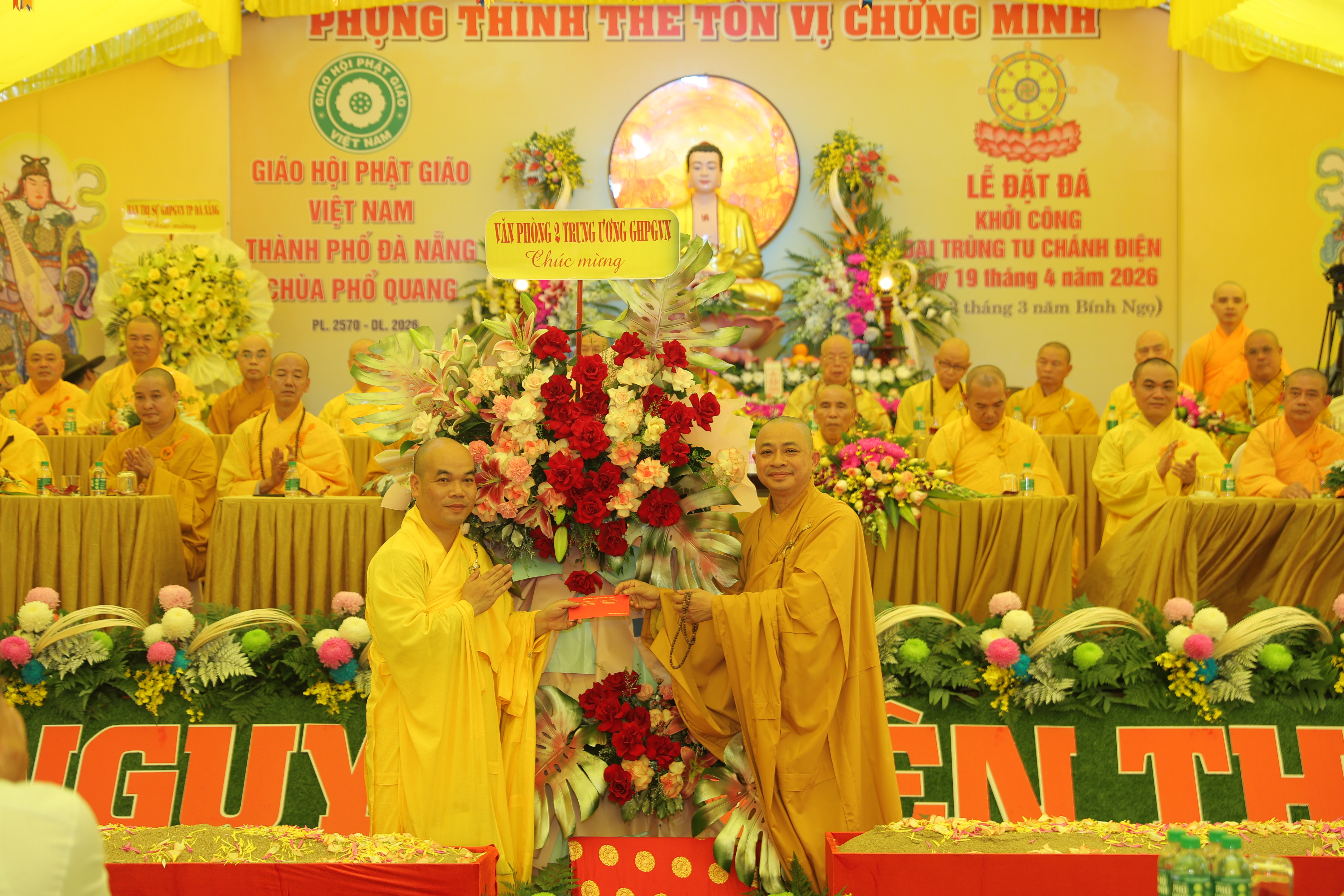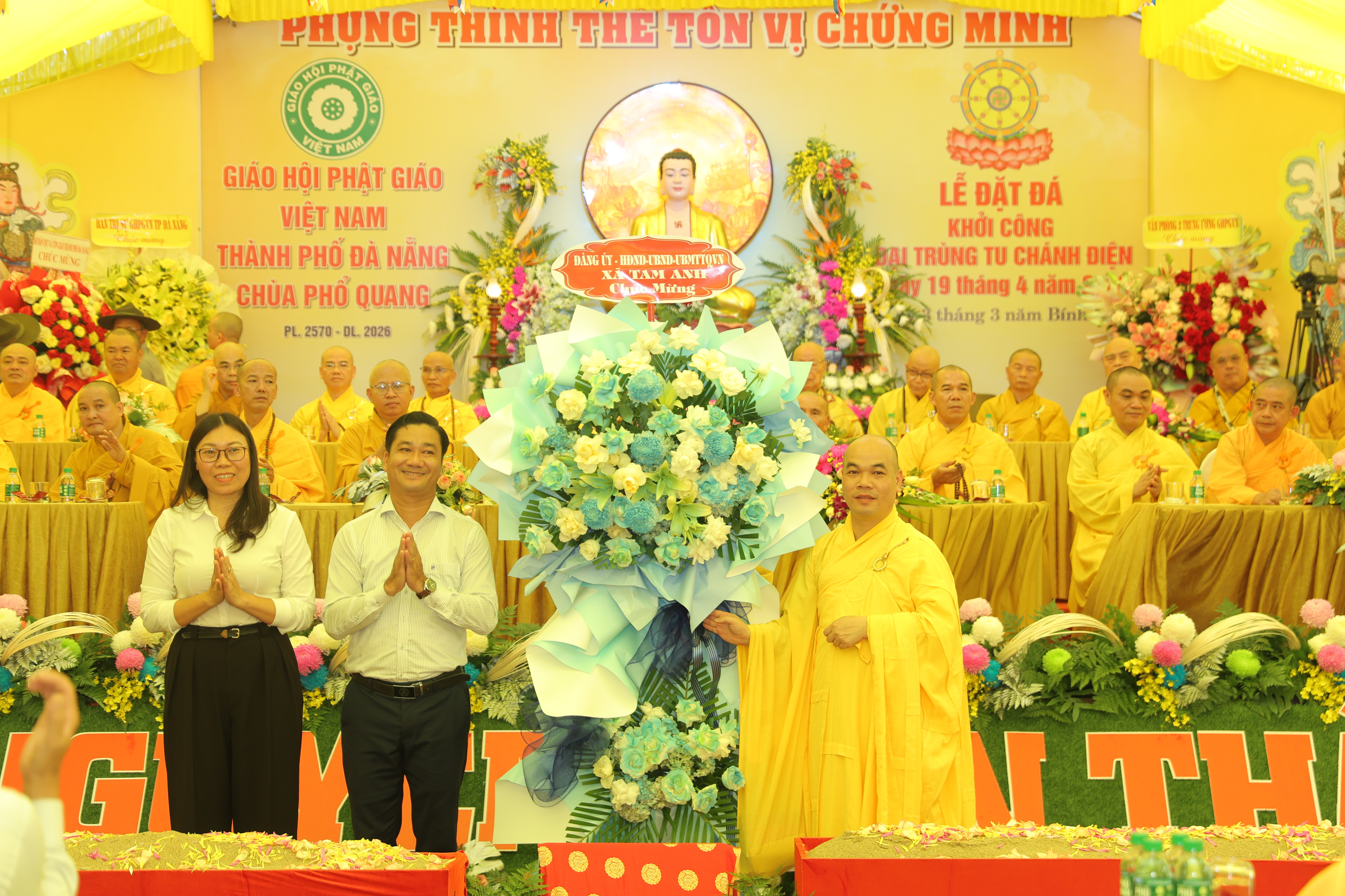 Trong không khí hân hoan, Đại đức Trụ trì chùa Phổ Quang nhận được nhiều lẵng hoa chúc mừng từ Văn phòng II Trung ương GHPGVN, Ban Trị sự PG TP.Đà Nẵng, lãnh đạo các cấp chính quyền: