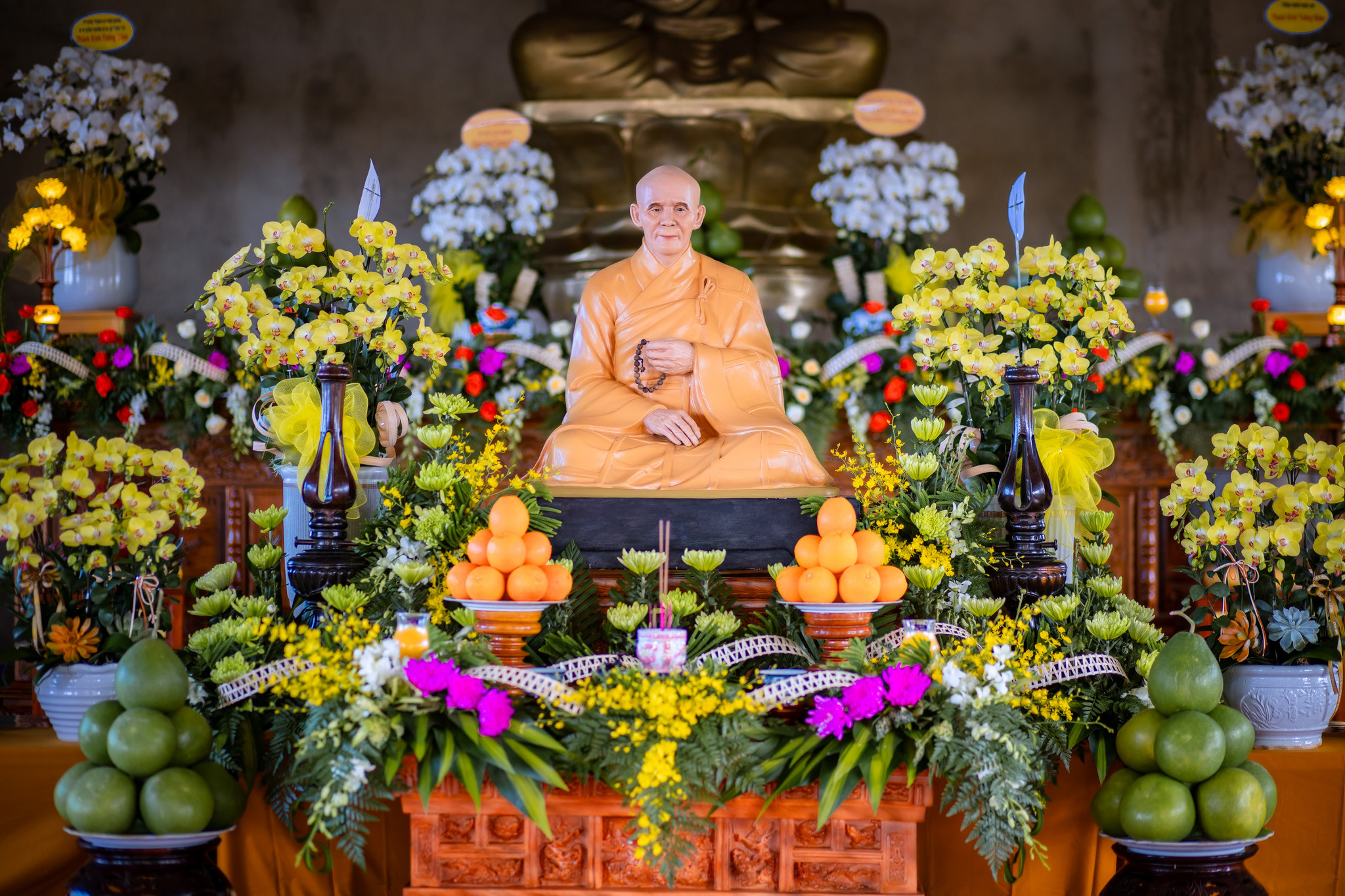 Tôn tượng Đức Phật Bổn Sư tọa thiền trên tòa sen được đúc bằng đồng đỏ, nặng 1,5 tấn, cao 2,9m, được chạm trổ hoa văn, do nhóm nghệ nhân cơ sở đúc đồng tại TP.Huế chế tác